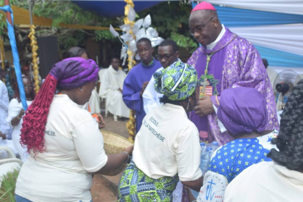 Monseigneur Roger Houngbédji, quant à lui, a retracé les perspectives pour l’avenir de la mission catéchétique dans l’Archidiocèse de Cotonou. Il propose des orientations : –pour une inculturation authentique et profonde visant l’enracinement de la parole de Dieu dans le terreau culturel béninois– sortir du livresque pour le vécu– faire la veille doctrinale et missionnaire– enfin, mettre la Parole de Dieu en pratique (JC 1,22). Le prélat a célébré la messe solennelle d’envoi en mission de la première promotion de l’École de la Catéchèse. Elle est concélébrée par les prêtres présents dans une atmosphère de joie qui a conduit vers la table festive marquant le partage dans la communion et l’espérance d’un avenir prometteur pour la Nouvelle École de la Catéchèse dans l’Archidiocèse de Cotonou. Pendant ces journées catéchétiques, le père SEVOH Roger, a prononcé la prière inaugurale sur la grotte « Notre-Dame de la Catéchèse ».