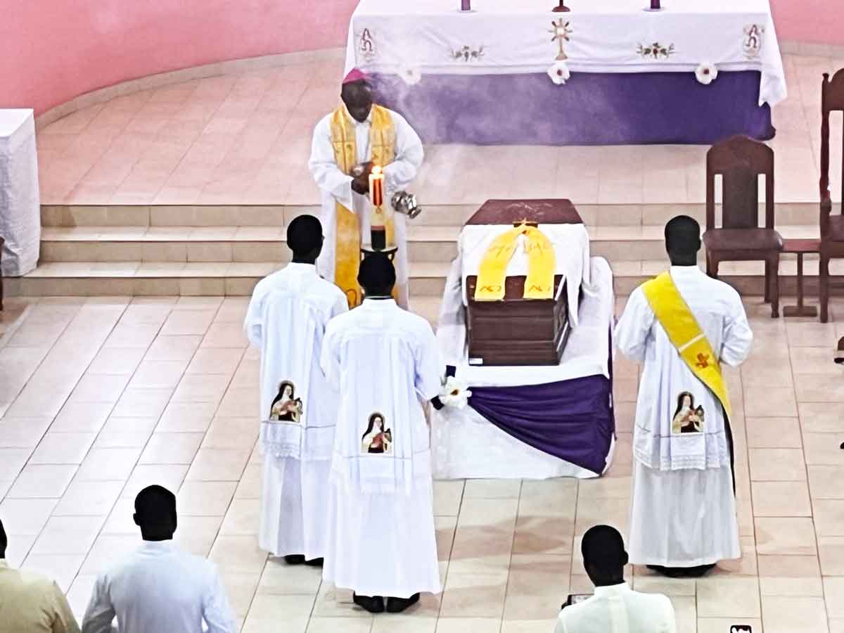 « On dirait que ce sont tous les prêtres du diocèse qui ont fait le déplacement pour venir honorer la mémoire du Père Assouma », déclare Mgr Roger Houngbédji, Archevêque de Cotonou, avant d’impartir la bénédiction finale lors de la messe des obsèques du Père Luc Assouma qu’il a présidée le lundi 10 novembre 2025 à Ouéga. En effet, ils étaient près de 200 prêtres à participer à la célébration avec de nombreuses religieuses et une foule de fidèles laïcs. Mgr Antoine Ganyé, Archevêque émérite de Cotonou, était également présent. Divers témoignages ont été lus provenant notamment de la Nonciature apostolique du Bénin ainsi que du diocèse de Bayonne avec lequel le défunt avec des liens.